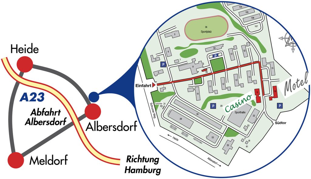 Der Gewerbepark liegt nur wenige Kilometer von der Autobahn 23 entfernt. Nehmen Sie die Abfahrt Albersdorf. Folgen Sie der Beschilderung in Richtung Heide. Nach Verlassen des Ortes erreichen Sie das Gelände mit unserem Motel auf der rechten Seite.